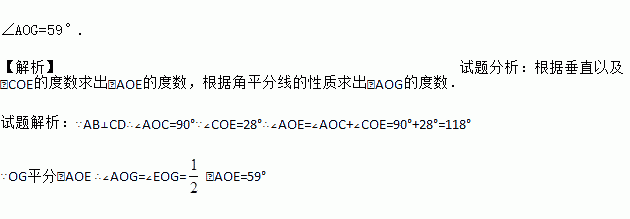 如图,AB、CD、EF交于O点,AB⊥CD,OG平分∠AOE,∠COE=28°求∠AOG的度数.