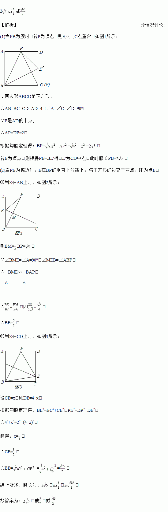 正方形ABCD的边长是4,点P是AD边的中点,点E是正方形边上的一点,若△PBE是等腰三角形,则腰长为________.