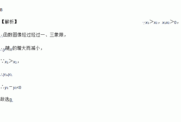 B 【解析】∵x1>x2,x1x2>0, ∴函数图像经过经过一、三象限, ∴y随x的增大而减小, ∵x1>x2, ∴y1