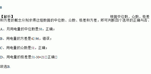 A. 中位数是50 B. 方差是42 C. 众数是51 D. 极差是21