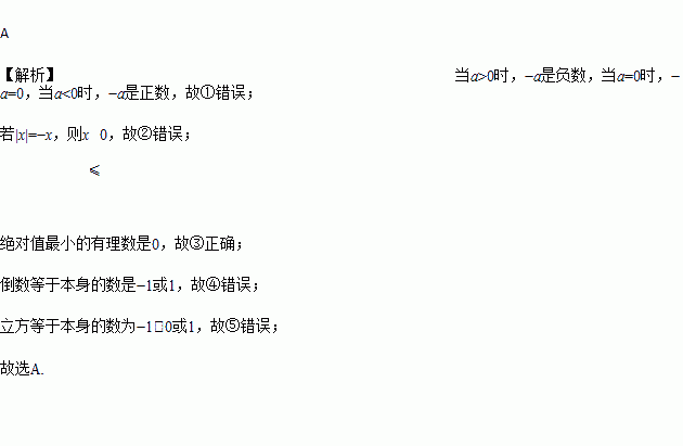 现有四种说法:①表示负数;②若,则x<0;③绝对值最小的有理数是0;④倒数等于本身的数是1;⑤立方等于本身的数为0和1.其中正确的个数 ( )