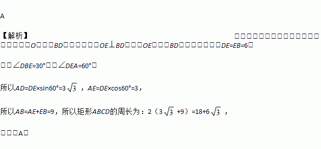 如图,在矩形ABCD中,对角线AC、BD交于点O,OE⊥BD交AB于E,若∠ABD=30°,DE=6,则矩形ABCD的周长为( )