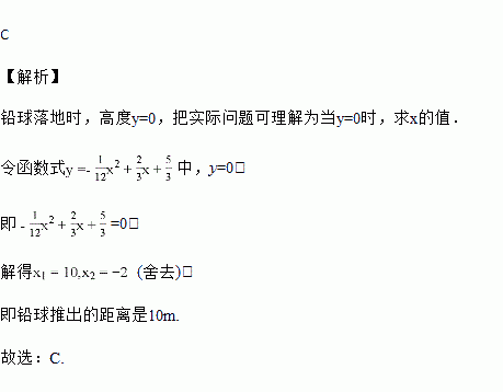 一学生推铅球,铅球行进的高度与水平距离之间的关系为,则学生推铅球的距离为( )