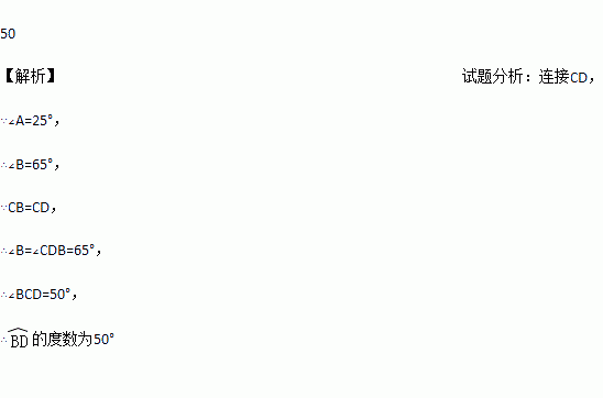 如图,在△ABC中∠A=25°,以点C为圆心,BC为半径的圆交AB于点D,交AC于点E,则的度数为_______.