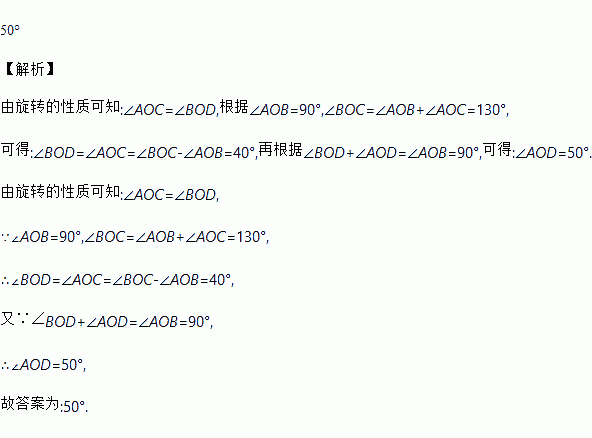 如图,将直角三角形AOB绕点0旋转得到直角三角形COD,若∠AOB=90°,∠BOC=130°,则∠AOD的度数为_____.