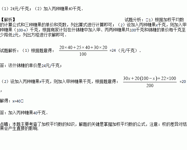 (2)为了使什锦糖的单价每千克至少降低2元,商家计划在什锦糖中加入甲、丙两种糖果共100千克,问其中最多可加入丙种糖果多少千克?