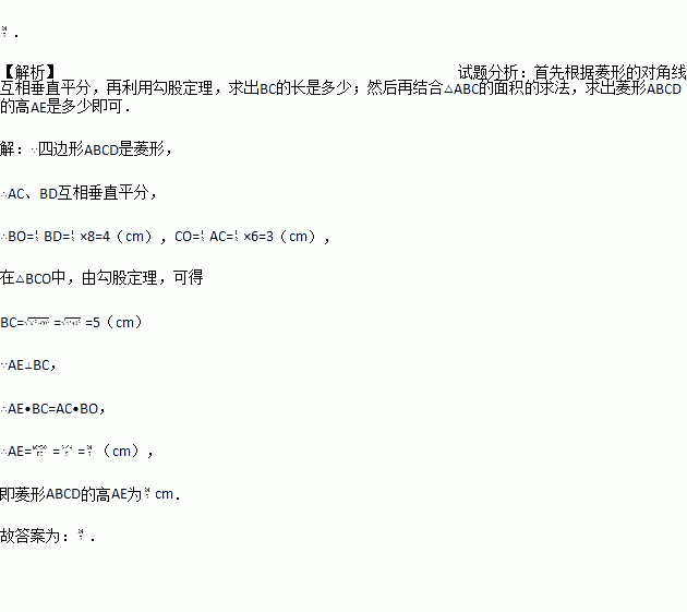 如图,在菱形ABCD中,AC=6cm,BD=8cm,则菱形ABCD的高AE为 cm.