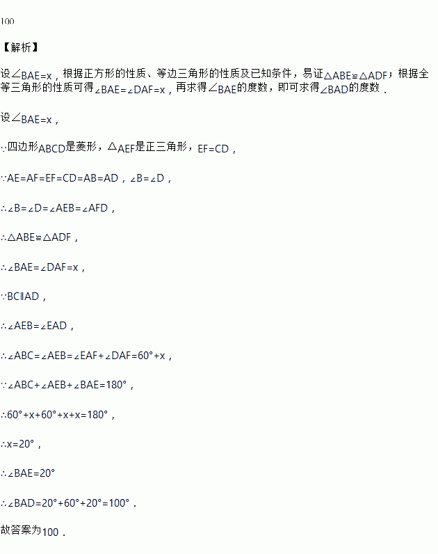 已知四边形是菱形,是正三角形,、分别在、上,且,则____度.