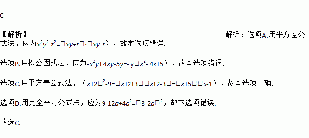 C 【解析】解析:选项A.用平方差公式法,应为x2y2-z2=(xy+z)·(xy-z),故本选项错误. 选项B.用提公因式法,应为-x2y+ 4xy-5y=- y(x2- 4x+5),故本选项错误. 选项C.用平方差公式法,(x+2)2-9=(x+2+3)(x+2-3)=(x+5)(x-1),故本选项正确. 选项D.用完全平方公式法,应为9-12a+4a2=(3-2a)2...