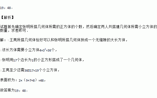 如图,在一次数学活动课上,张明用17个边长为1的小正方形搭成了一个几何体,然后他请王亮用其他同样的小正方体在旁边再搭一个几何体,使王亮所搭几何体恰好可以和张明所搭几何体拼成一个无缝隙的大长方体(不改变张明所搭几何体的形状),那么王亮至少还需要 个小立方体,王亮所搭几何体的表面积为 .