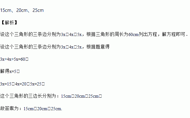 若三角形的周长是60cm,且三条边的比为3:4:5,则三边长分别为__________.