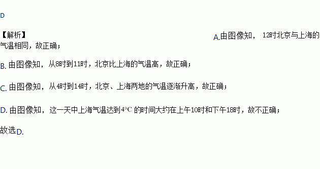 C. 从4时到14时,北京、上海两地的气温逐渐升高