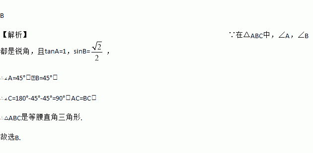 在中, 都是锐角,tanA=1,sinB=, 你认为最确切的判断是( )