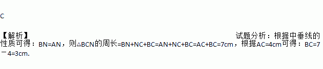 如图,在△ABC中,AC=4 cm,线段AB的垂直平分线交AC于点N,△BCN的周长是7 cm,则BC的长为( )