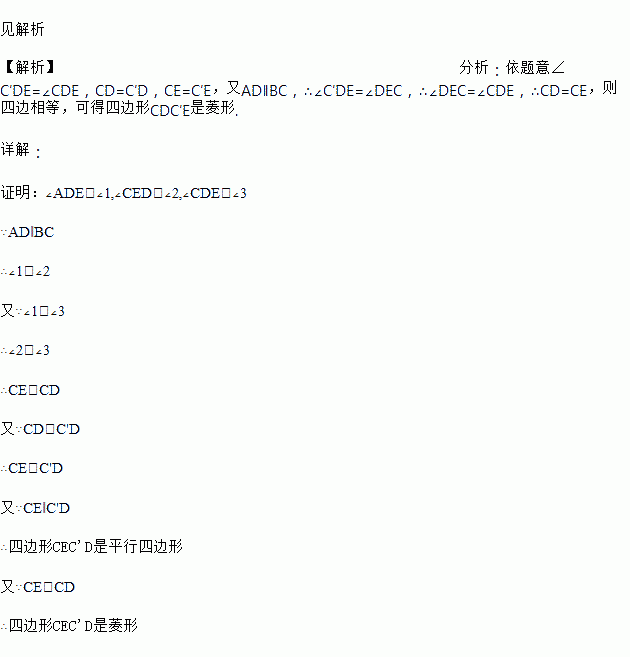 如图,在梯形纸片ABCD中,AD//BC,AD>CD,将纸片沿过点D的直线折叠,使点C落在AD上的点C处,折痕DE交BC于点E,连结C′E.