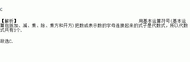 C 【解析】用基本运算符号(基本运算包括加、减、乘、除、乘方和开方)把数或表示数的字母连接起来的式子是代数式,所以代数式共有3个. 故选C.