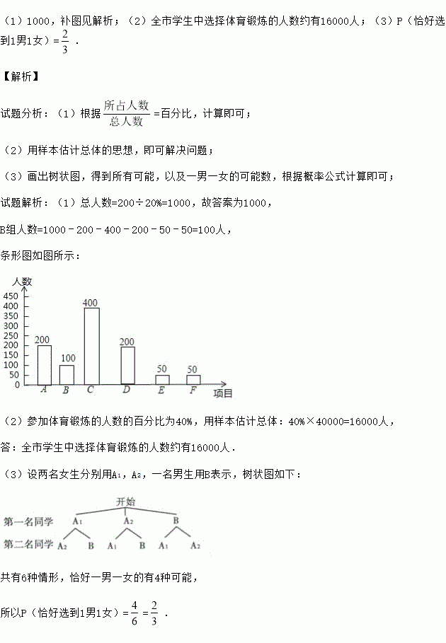 (2)全市约有4万名在校初中学生,试估计全市学生中选择体育锻炼的人数约有多少人?