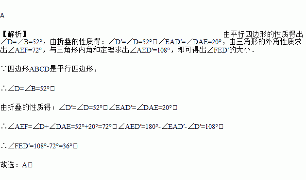 如图,在□ABCD中,E为边CD上一点,将△ADE沿AE折叠至△AD′E处,AD′与CE交于点F.若∠B=52°,∠DAE=20°,则∠FED′的大小为_______.