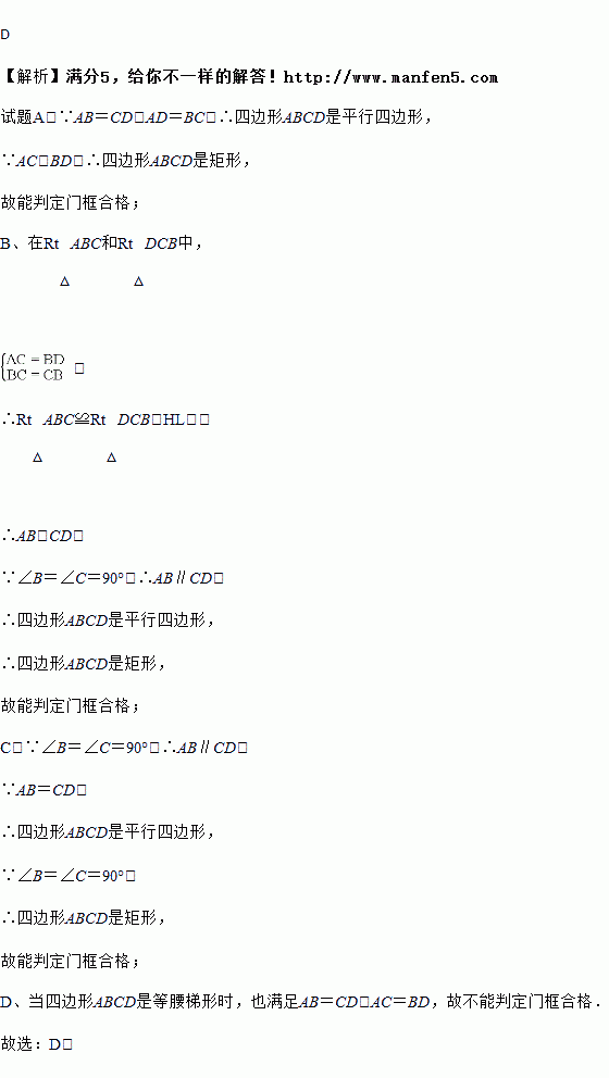 A. AB=CD,AD=BC,AC=BD B. AC=BD,∠B=∠C=90° C. AB=CD,∠B=∠C=90° D. AB=CD,AC=BD