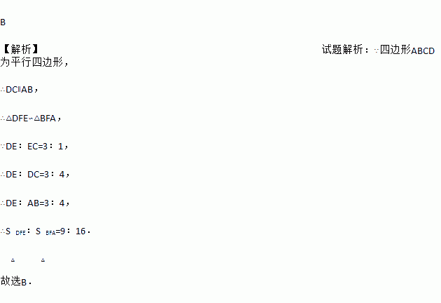 B 【解析】试题解析:∵四边形ABCD为平行四边形, ∴DC∥AB, ∴△DFE∽△BFA, ∵DE:EC=3:1, ∴DE:DC=3:4, ∴DE:AB=3:4, ∴S△DFE:S△BFA=9:16. 故选B.