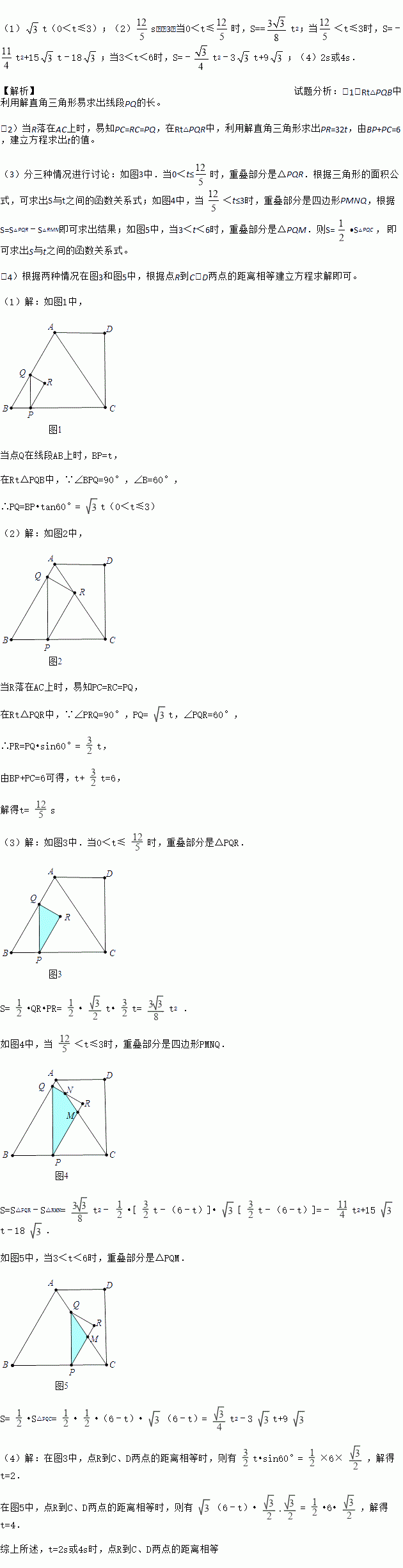 (1)t(0<t≤3);(2)s;(3)当0<t≤时,S==t2;当<t≤3时,S=﹣t2+15t﹣18;当3<t<6时,S=﹣t2﹣3t+9;(4)2s或4s. 【解析】试题分析:(1)Rt△PQB中利用解直角三角形易求出线段PQ的长。 (2)当R落在AC上时,易知PC=RC=PQ,在Rt△PQR中,利用解直角三角形求出PR=32t,由BP+PC=6,建立方程求出t的值。 (3...