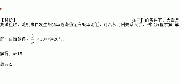 在一个不透明的盒子中装有a个除颜色外完全相同的球,这a个球中只有3个红球,若每次将球充分搅匀后,任意摸出1个球记下颜色再放回盒子.通过大量重复试验后,发现摸到红球的频率稳定在20%左右,则a的值约为( )