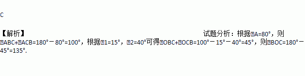 如图,点O是△ABC内一点,∠A=80°,∠1=15°,∠2=40°,则∠BOC等于( )