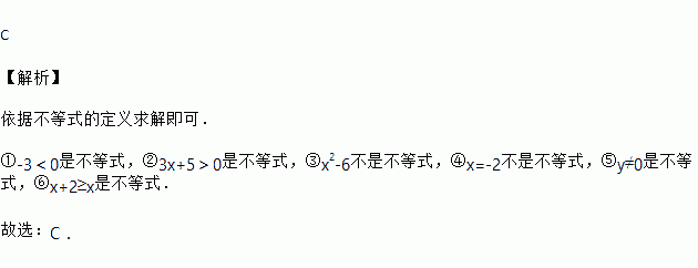 在数学表达式:①-3<0,②3x+5>0,③x2-6,④x=-2,⑤y≠0,⑥x+2≥x中,不等式的个数是( ).