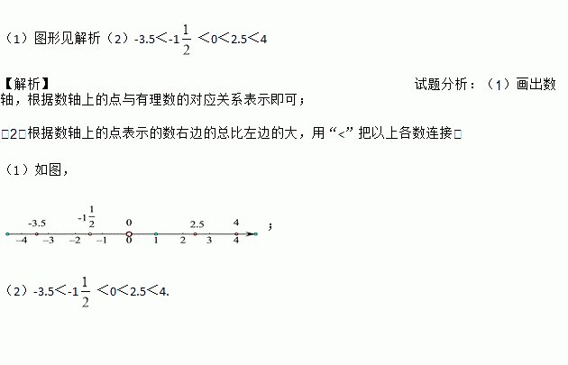(1)图形见解析(2)-3.5<-1<0<2.5<4 【解析】试题分析:(1)画出数轴,根据数轴上的点与有理数的对应关系表示即可; (2)根据数轴上的点表示的数右边的总比左边的大,用“<”把以上各数连接. (1)如图, ; (2)-3.5<-1<0<2.5<4.