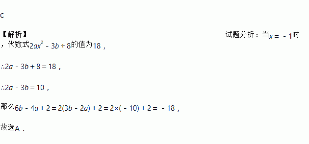C 【解析】试题分析:当x=-1时,代数式2ax2-3b+8的值为18, ∴2a-3b+8=18, ∴2a-3b=10, 那么6b-4a+2=2(3b-2a)+2=2×(-10)+2=-18, 故选A.
