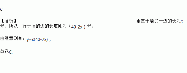 C 【解析】垂直于墙的一边的长为x米,所以平行于墙的边的长度则为(40-2x)米, 由题意则有:y=x(40-2x), 故选C.