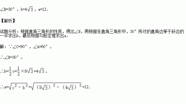 (2015秋•安徽月考)根据下列条件解直角三角形:在Rt△ABC中,a、b、c分别为∠A、∠B、∠C对应边的长,∠C=90°,c=8,∠A=60°.