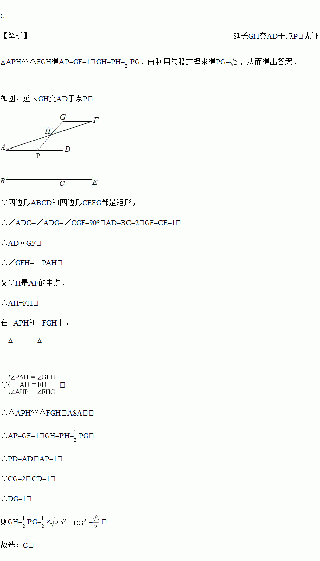 矩形ABCD与CEFG,如图放置,点B,C,E共线,点C,D,G共线,连接AF,取AF的中点H,连接GH.若BC=EF=2,CD=CE=1,则GH=( )