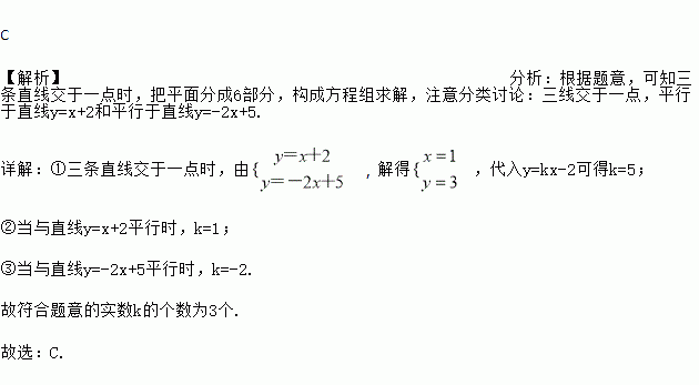 已知在平面内有三条直线y=x+2,y=-2x+5,y=kx―2,若这三条直线将平面分为六部分,则符合题意的实数k的个数有( )