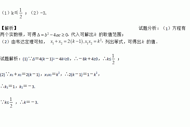 关于x的方程x2﹣2(k﹣1)x+k2=0有两个实数根x1、x2.