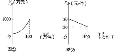 我市在党中央实施“精准扶贫”政策的号召下,大力开展科技扶贫工作,帮助农民组建农副产品销售公司,某农副产品的年产量不超过100万件,该产品的生产费用y(万元)与年产量x(万件)之间的函数图象是顶点为原点的抛物线的一部分(如图①所示);该产品的销售单价z(元/件)与年销售量x(万件)之间的函数图象是如图②所示的一条线段,生产出的产品都能在当年销售完,达到产销平衡,所获毛利润为W万元.(毛利润=销售额﹣生产费用)
