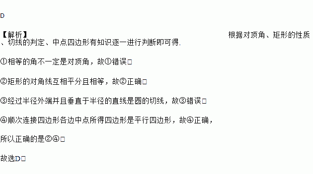 ①相等的角是对顶角 ②矩形的对角线互相平分且相等 ③垂直于半径的直线是圆的切线 ④顺次连接四边形各边中点所得四边形是平行四边形.