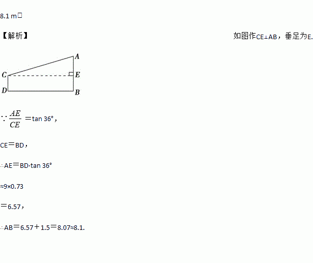 如图,为了测量电线杆AB的高度,小明将测量仪放在与电线杆的水平距离为9m的D处.若测角仪CD的高度为1.5m,在C处测得电线杆顶端A的仰角为36°,则电线杆AB的高度约为____(精确到0.1m).(参考数据sin36°≈0.59.cos36°≈0.81,tan36°≈0.73).