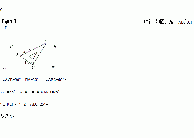 C 【解析】分析:如图,延长AB交CF于E, ∵∠ACB=90°,∠A=30°,∴∠ABC=60°。 ∵∠1=35°,∴∠AEC=∠ABC﹣∠1=25°。 ∵GH∥EF,∴∠2=∠AEC=25°。 故选C。
