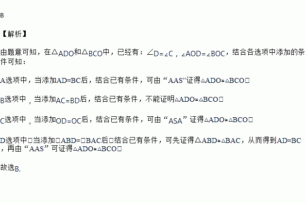 如图,AC与BD相交于点O,∠D=∠C,添加下列哪个条件后,仍不能使△ADO≌△BCO的是( )