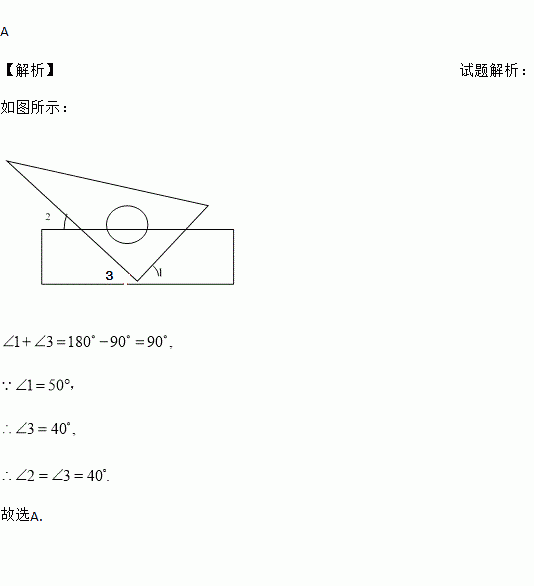 如图,将一块直角三角尺的直角顶点放在直尺的一边上,如果∠1=50°,那么∠2的度数是 ( )