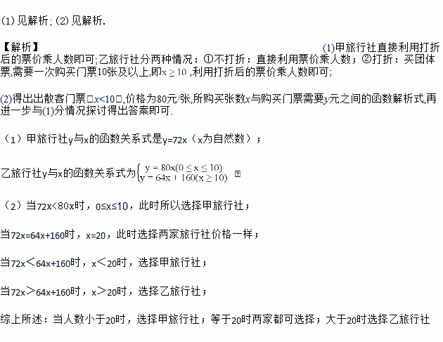 某景点的门票零售价为80元/张,“五一”黄金周期间,甲乙两家旅行社推出优惠活动,甲旅行社一律九折优惠;乙旅行社对10人以内(含10人)不优惠,超过10人超出部分八折优惠,某班部分同学去该景点旅游.设参加旅游人数为x人,购买门票需要y元.