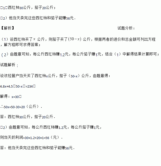 (1)西红柿30公斤,茄子20公斤; (2)他当天卖完这些西红柿和茄子能赚56元. 【解析】试题分析: (1)设西红柿买了公斤,则茄子买了公斤,根据两者的进价和总金额可列出方程,解方程即可求得答案; (2)由题意可知,每公斤西红柿赚1.2元,每公斤茄子赚1元,结合(1)中解得结果计算即可; 试题解析: 设该经营户当天买了西红柿x公斤,茄子(50-x)公斤,由题意...