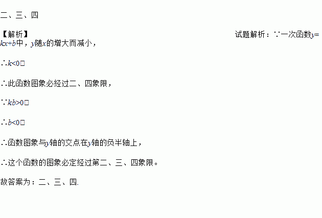 二、三、四 【解析】试题解析:∵一次函数y=kx+b中,y随x的增大而减小, ∴k<0, ∴此函数图象必经过二、四象限, ∵kb>0, ∴b<0, ∴函数图象与y轴的交点在y轴的负半轴上, ∴这个函数的图象必定经过第二、三、四象限。 故答案为:二、三、四.