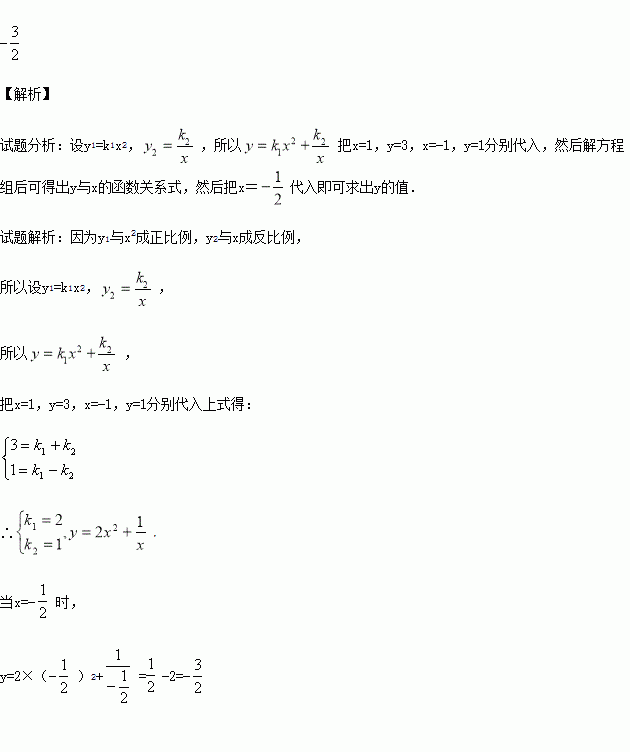 已知:y=y1+y2,y1与x2成正比例,y2与x成反比例,且x=1时,y=3;x=时,y=1.求x=时,y的值.