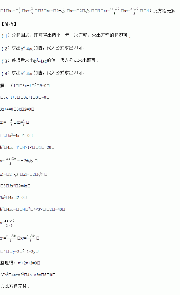 (1)(3x+1)2﹣9=0;(2)x2+4x﹣1=0;(3)3x2﹣2=4x;(4)(y+2)2=1+2y.