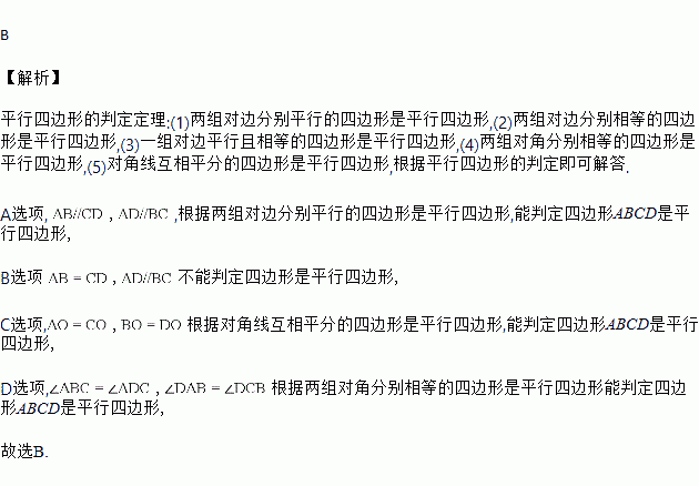 已知:四边形ABCD的对角线AC、BD相交于点O,则下列条件不能判定四边形ABCD是平行四边形的是![]()