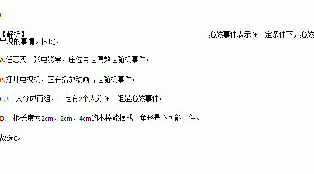 C. 3个人分成两组,一定有2个人分在一组 D. 三根长度为2cm,2cm,4cm的木棒能摆成三角形