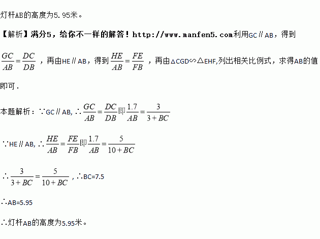 小强为测量一路灯杆AB的高度,在灯光下,小强在C处的影长为3米,沿BC方向行走了5米到E处,此时小强的影长为5米,若小强身高为1.7米,求路灯杆AB的高度。