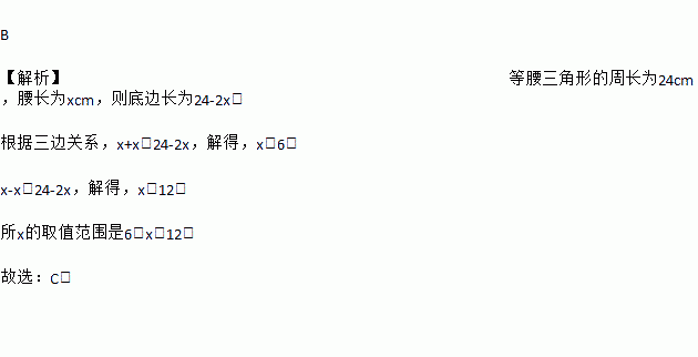 等腰三角形的周长为24cm,腰长为xcm,则x的取值范围是( )